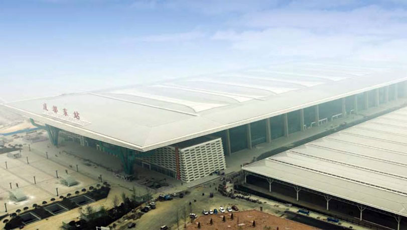 成都火車東站位于成都市東三環(huán)路,2010年開始建設(shè),車站面積約22萬(wàn)平方米。在設(shè)計(jì)上引入了大量的文化元素,東、西廣場(chǎng)的進(jìn)出口都用了三星堆的青銅面具元素,屋頂引入了金沙太陽(yáng)神鳥的火焰造型,被定為一等客運(yùn)站。使用了寶鋼鍍鋁鋅