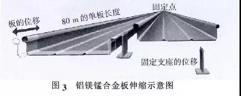 屋面板基材通常采用國際牌號AA3004 的鋁鎂錳合金壓型制作,合金狀態(tài)為H36/H46。其屈服強(qiáng)度≥190 MPa,抗拉強(qiáng)度在240~285 MPa,伸長率≥3%。收邊板基材采用國際牌號AA3004 的鋁鎂錳合金壓型制作,合金狀態(tài)為H34/H44,其屈服強(qiáng)度170MPa ,抗拉強(qiáng)度在220~265 MPa ,伸長率≥3%。